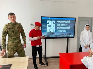 Юнармейцы совместно с рядовым Автаевым И.Д. и прапорщиком Левшивой С.И. Воинской части 6776 провели классный час:"Международный день памяти о Чернобыльской катастрофе"